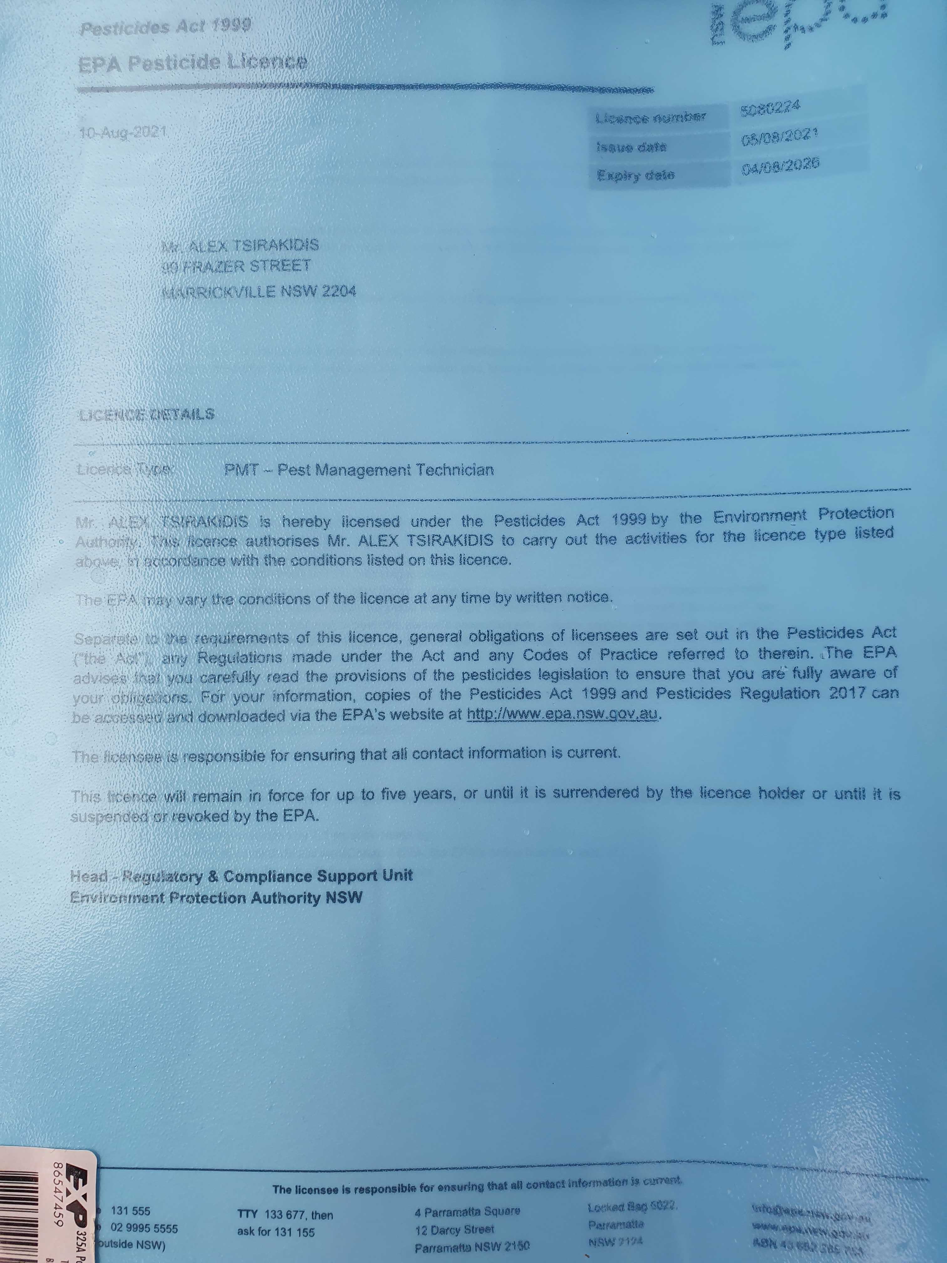Staff Pest Control License - Alex Tsirakidis